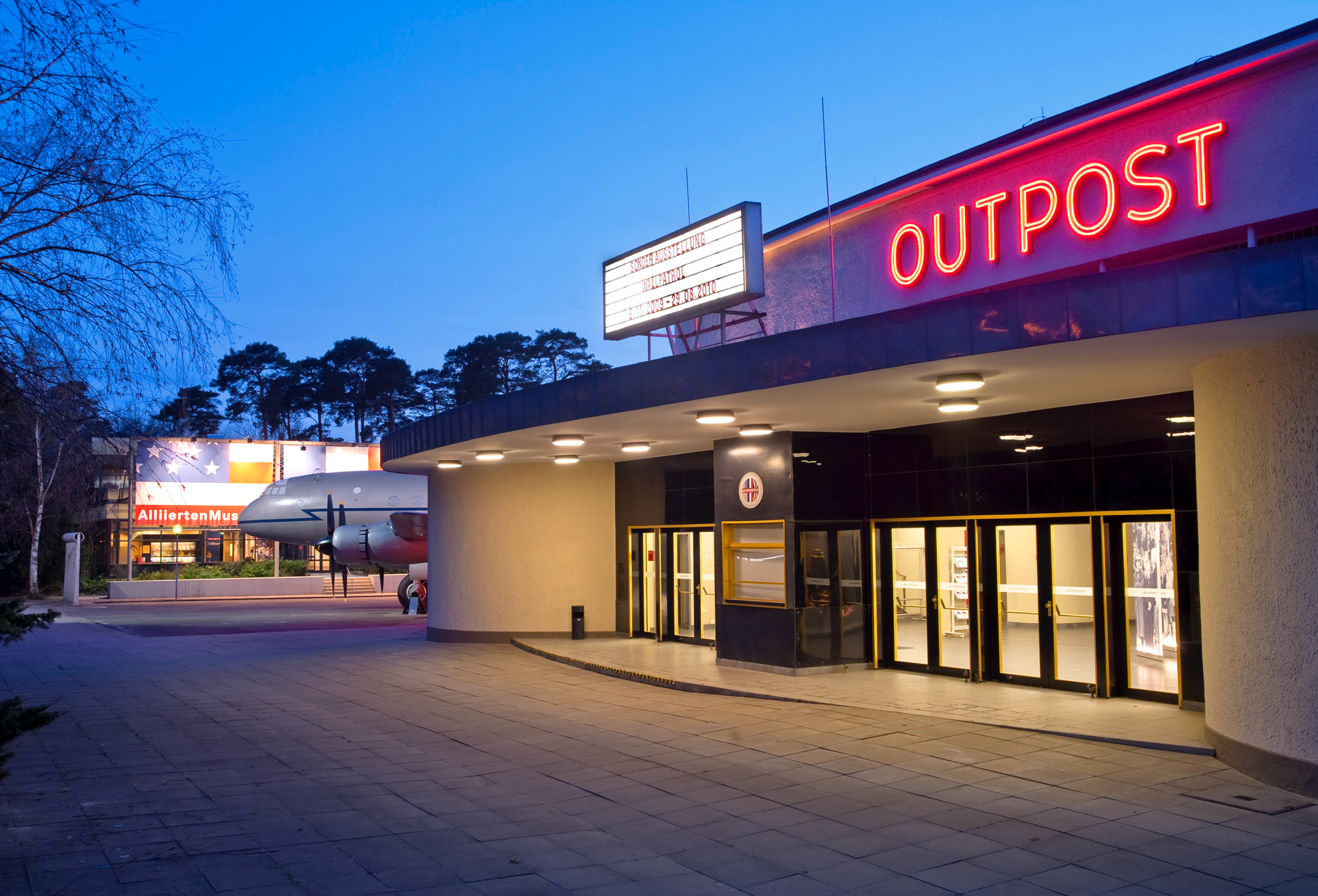 <br><br><br><br><p class="MsoNormal">Eingang des AlliiertenMuseums ‚Outpost‘ in der Dämmerung:<br>roter Neon-Schriftzug, beleuchtetes Vordach; links ein ausgestelltes<br>Propellerflugzeug vor Flaggenfassade.</p>