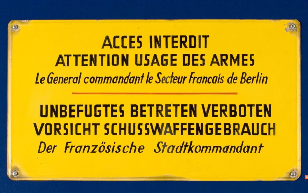 Nach dem Zweiten Weltkrieg teilten die Siegermächte Berlin in vier Sektoren auf. Schilder markierten die Sektorenübergänge. Auf westlicher Seite waren sie meist auf Englisch, Französisch und Deutsch verfasst.